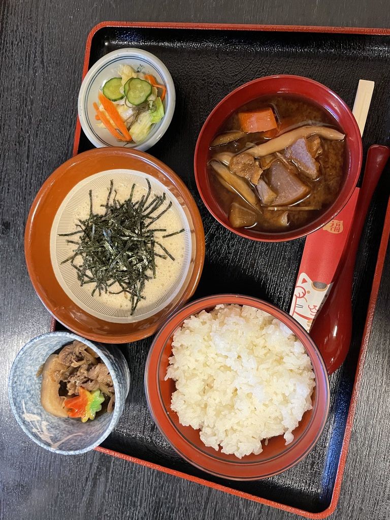 自然薯とろろ・(初)牛肉と根菜の煮物・麦飯・田舎汁・お新香