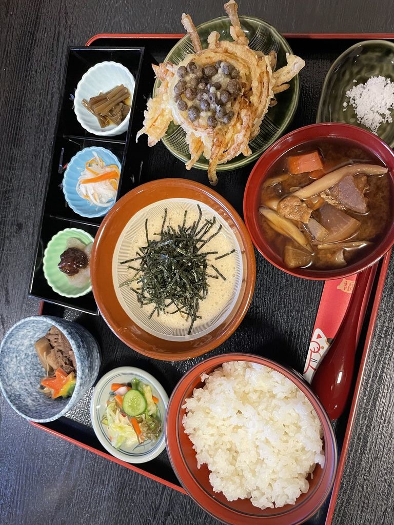 自然薯とろろ・名物むかごかき揚げ・(初)牛肉と根菜の煮物・秋の小鉢三点盛(自家製こんにゃく田楽等)・麦飯・田舎汁・お新香